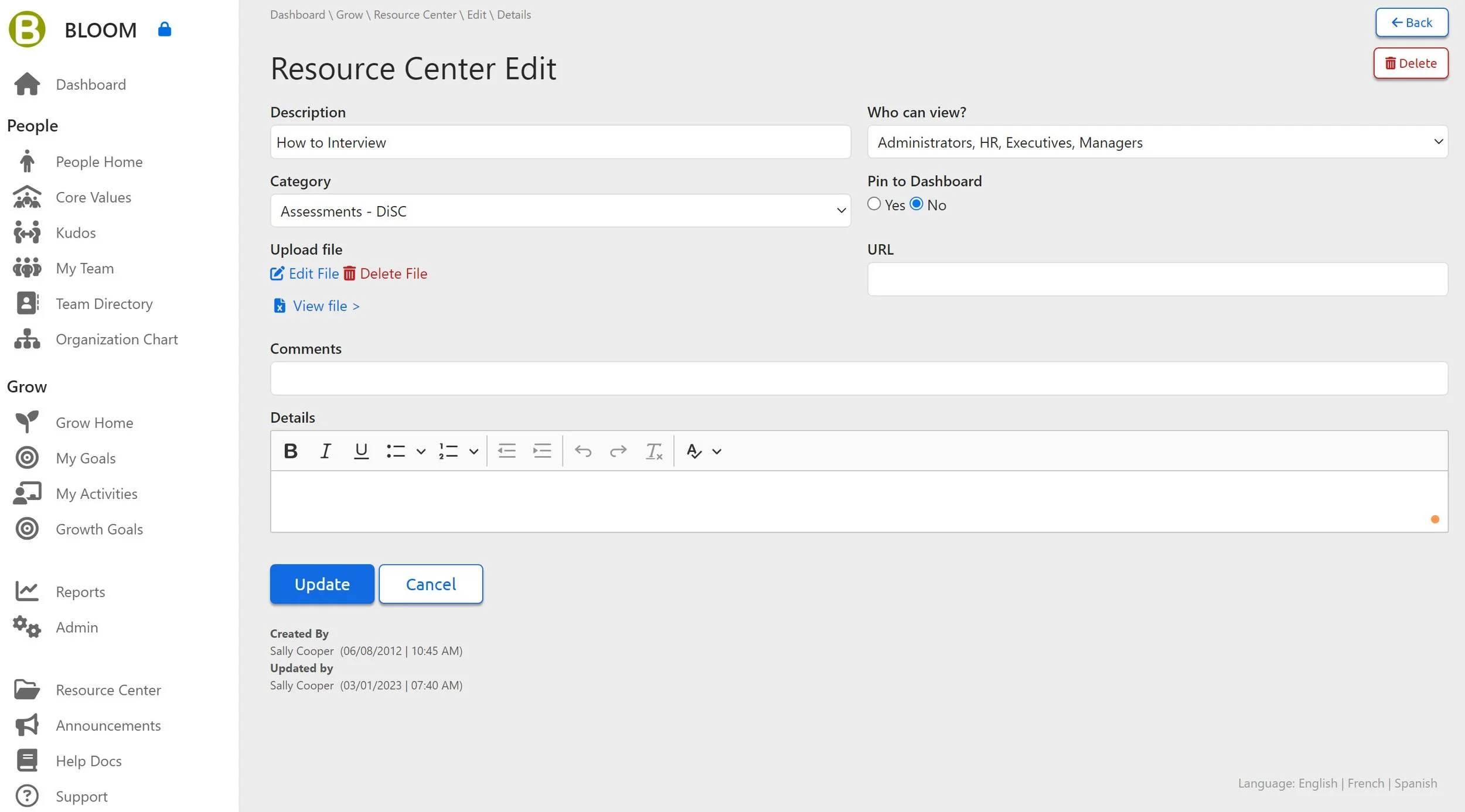BLOOM offers a comprehensive information center where you can upload unlimited company files such as policies, forms, procedures, images and links to other websites for team member access.